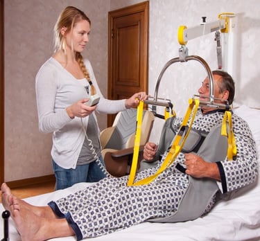 Elevadores de transferência e cadeiras de transferência, facilitando a mobilidade com segurança tanto para o usuário quanto para o cuidador.